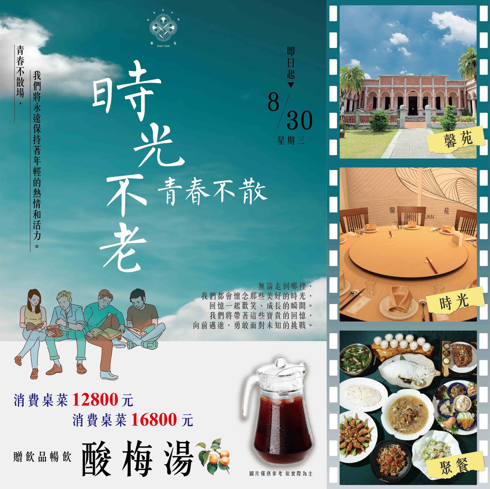 消費NT$12,800桌菜+10%服務費,即享酸梅湯無限暢飲,加人加價,一人1280元