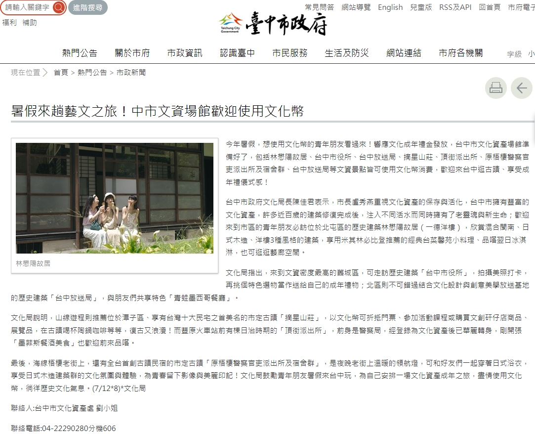 臺中市政府文化幣媒體文宣:一德洋樓宣傳照,人文各個園區都上榜。