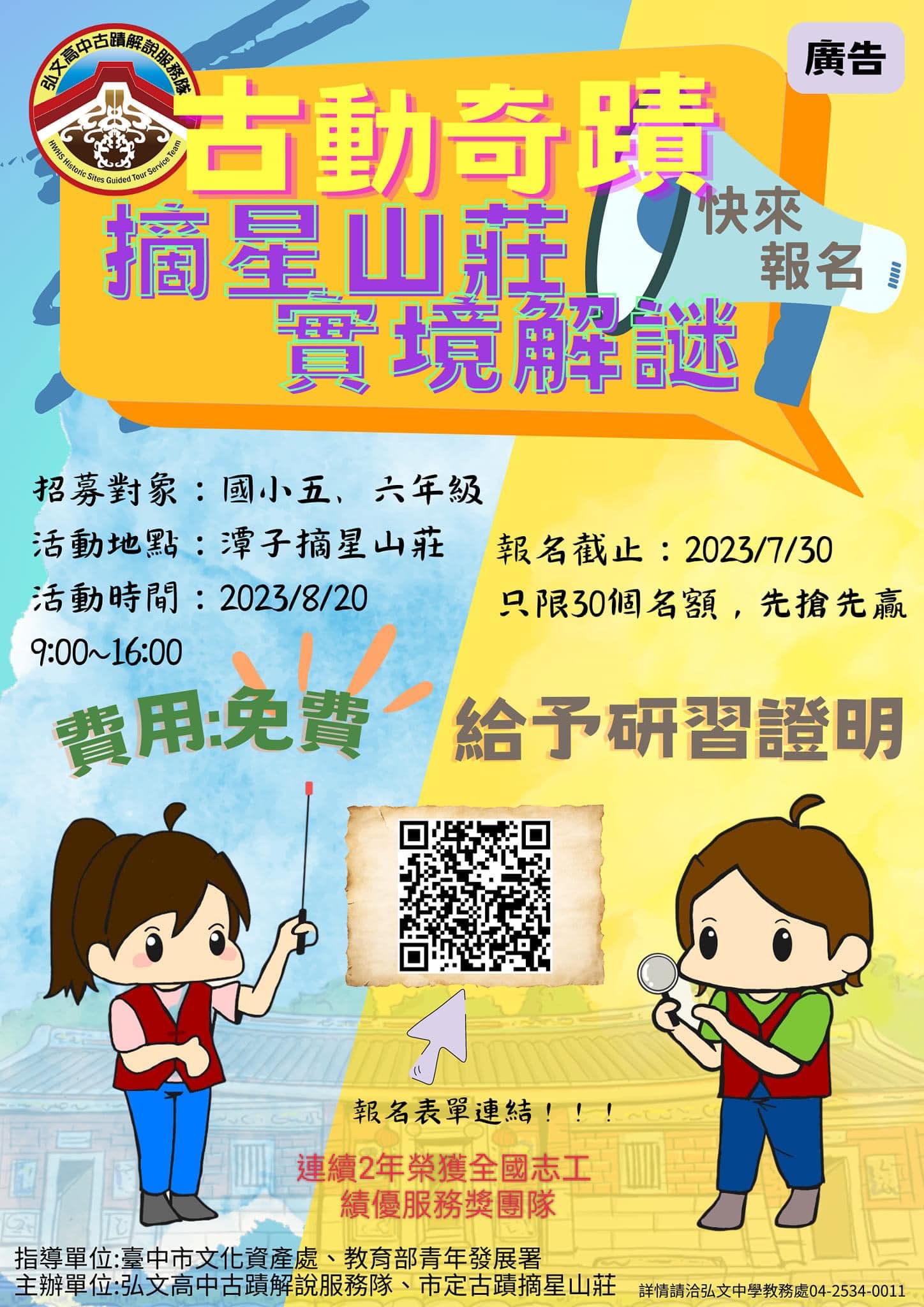 「古動奇蹟」摘星山莊實境解謎 日期:8月20日(日) 時間:9:00-16:00 地點:台中市市定古蹟 摘星山莊 由 弘文高中古蹟解說服務隊主辦, 帶領國小五、六年級學生, 透過實境解謎,探索摘星山莊的奧秘!!