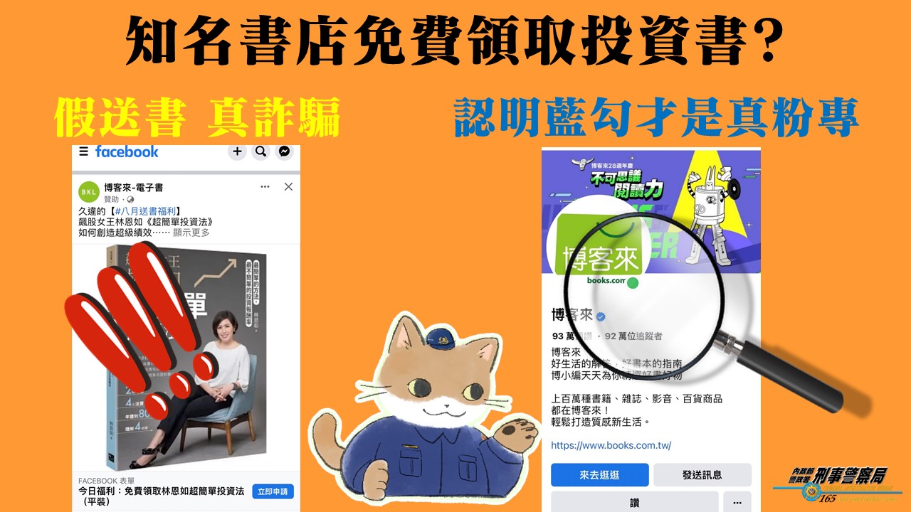 另外佯稱免費、公益活動贈書之臉書貼文,請慎防就是假投資詐騙唷~