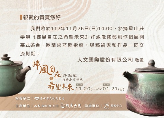 ⟪拂風自在之希望未來⟫ 許淑敏陶藝創作個展 帶著微笑, 享受微風輕拂的自然表情, 有著極大的感染力與生命力。 「拂風自在之希望未來」 此檔藝術家是許淑敏老師, 許老師透過作品,傳達了自由自在的喜悅,溫暖療癒人心,是舒暢的心靈感受。 誠摯邀請您到場觀賞! 【 展 期 資 訊 】 展出日期:2023.11.20-2024.1.27(周二、周三休館) 展出時間:9:00~18:00 展出地點:摘星山莊|將軍馬廄藝文展場