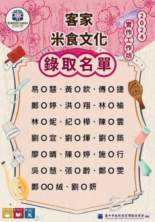 客家米食文化 米食體驗的錄取名單也出爐啦 這麼多客家美食 是不是很期待呀~ 快來找找有沒有自己的名字吧 恭喜以下20位錄取的朋友們 行前通知將於活動前三天發至各位信箱 沒錄取的朋友們也別難過 關注東勢客家文化園區粉絲專頁 更多活動待您解鎖 ! #東勢客家文化園區 #臺中客家故事館 #臺中市政府客家事務委員會 #聽看臺中客 #臺中東勢新丁粄 #客家米食文化