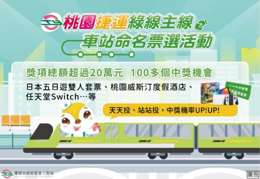 #桃園捷運綠線主線車站命名票選活動開跑 快來一起為桃園捷運主線車站取個響亮的名字 參與投票者將有機會獲得精美禮品 活動時間:06/11 - 06/24止,共14日 活動方式:採網路投票,每人每天皆可參與一次,可針對單一或多個想要命名的車站進行作答 本活動備有豐富超值獎品包括: 日本五日遊雙人套票 桃園威斯汀度假酒店住宿券 任天堂Switch 藍芽耳機 等100多個精彩好禮等你來拿! 快來投票,讓桃園的新捷運線站名更加有趣與獨特 #桃園捷運工程局 #桃園捷運 #車站命名 #票選活動 活動網址
