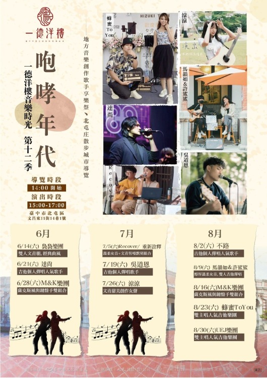 快把海報上的藝人演出行程在行事曆上登記或標註,其實也可以每個周末下午都來一德走走逛逛,嗑美食、品好茶、賞藝術與聽好歌,在草地上奔跑或在後花園漫步,一同感受這百年古典莊園不一樣的美。