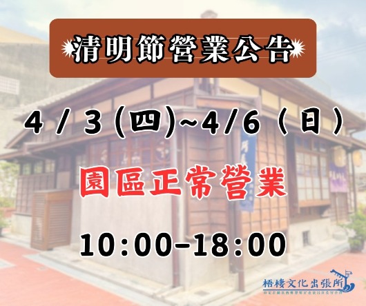 【 清明連假營業公告】 連假四天~歡迎來梧棲老街走一走~ 梧棲老街有什麼? 有朝元宮、真武宮~來場宗廟之旅, 有林異香齋~品嚐百年老店的烘焙香, 有梧棲文化出張所~ 走進日治時期警察官吏派出所暨宿舍, 吃翌日冰淇淋,穿日式浴衣, 體驗梧棲老街上的日式風情。