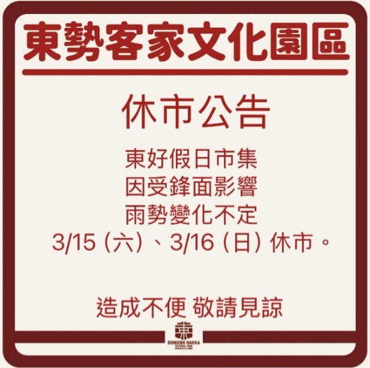 東好市集 本週停市 因受鋒面影響,雨勢變化不定 本週將暫停市集活動。 不便之處,敬請見諒。 東勢客家文化園區聯絡資訊 電話:04-2588-8505 地址:臺中市東勢區中山路1號 開館時間:AM9:00 - PM17:00