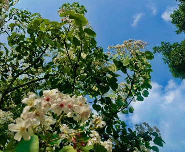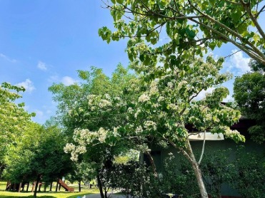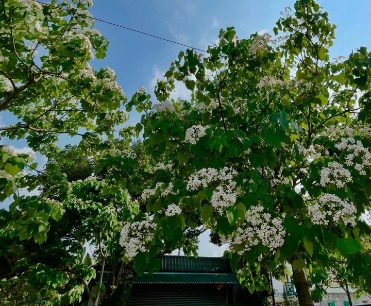 園區梧桐花迎春綻放,淡紫花穗綴滿枝頭,隨風翻飛如紫瀑。