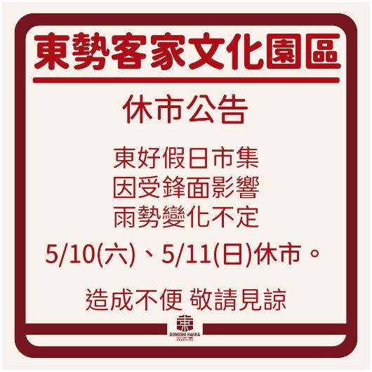 因受鋒面影響,雨勢變化不定 本週將暫停市集活動。 不便之處,敬請見諒。 東勢客家文化園區聯絡資訊 電話:04-2588-8505 地址:臺中市東勢區中山路1號 開館時間:AM9:00 - PM17:00