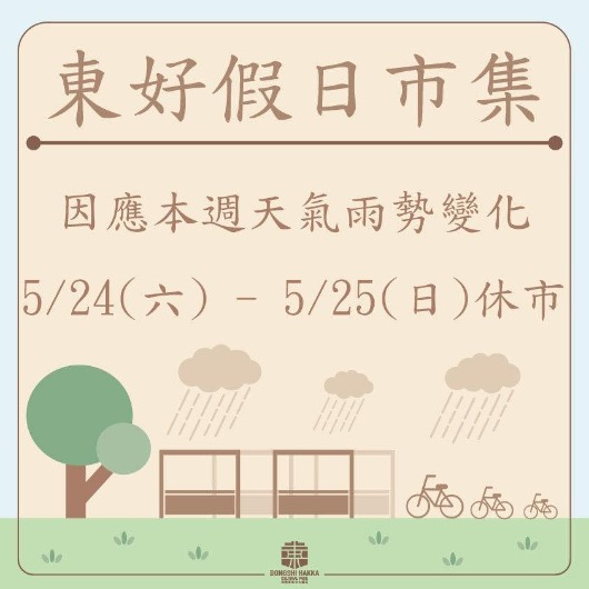 因受鋒面影響,雨勢變化不定 本週將暫停市集活動。 不便之處,敬請見諒。 東勢客家文化園區聯絡資訊 電話:04-2588-8505 地址:臺中市東勢區中山路1號 開館時間:AM9:00 - PM17:00